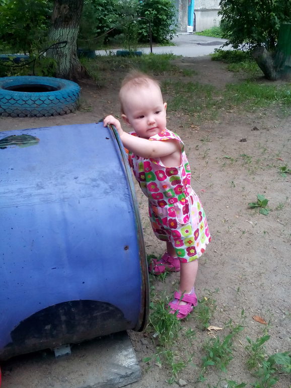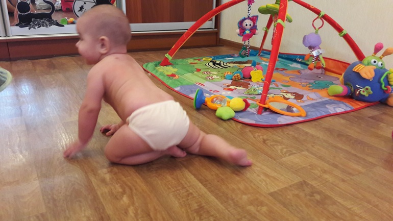 Она уже ползает во всю на четвереньках, встает у опоры и пытается ходить.