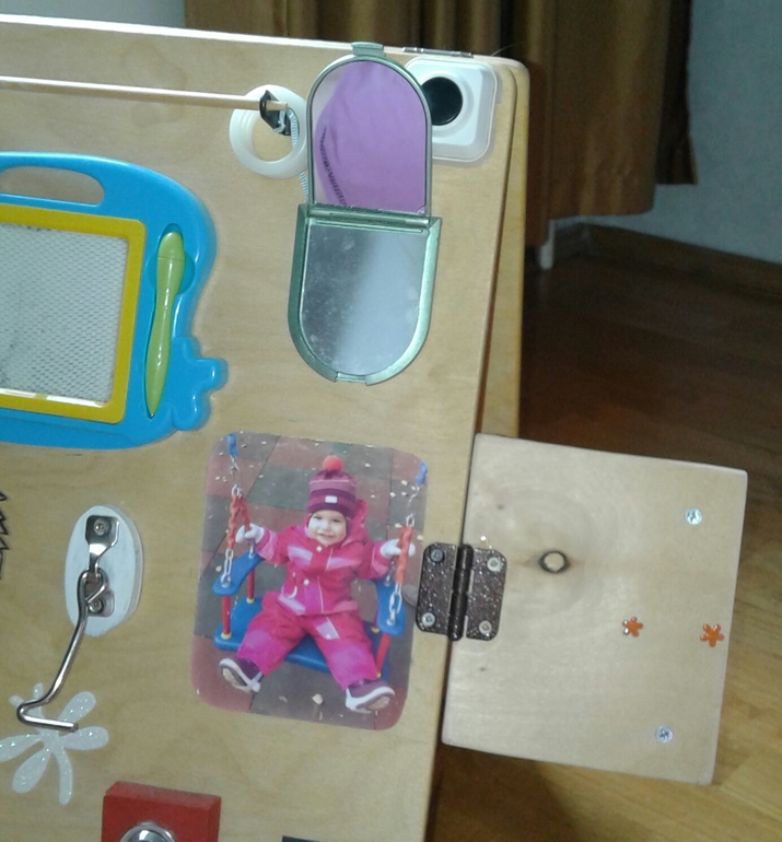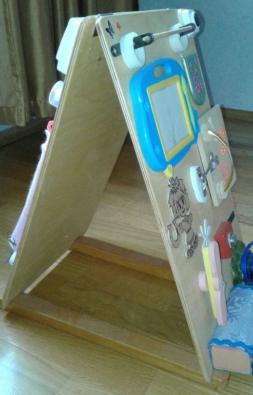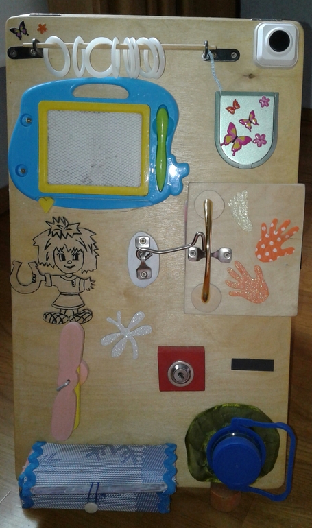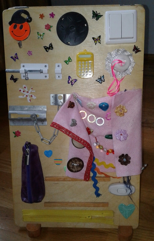 Кнопки, выключатели, фонарик, крутилки(колесики для мебели),дверки-это интересует. Липучки,шнуровки,молния пока мимо,хотя на обуви любит это дело...может позже. Замочки только учится открывать пока. Хорошая затея,сделать самим! Пусть по деньгам также, но со всей душой! И папе интересно,и маме и детёнышу,конечно!