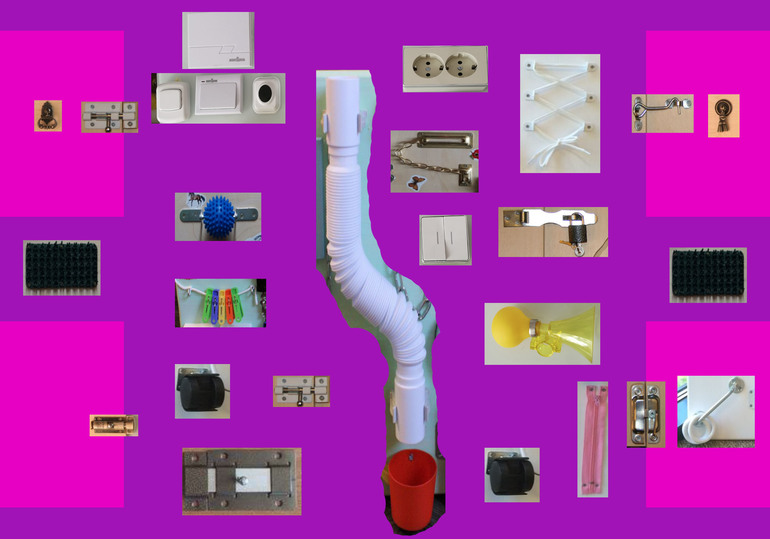 Замочки всякие, выключатели. Вешалка (рожица оранжевая) на нее игрушки с петельками вешала наша .