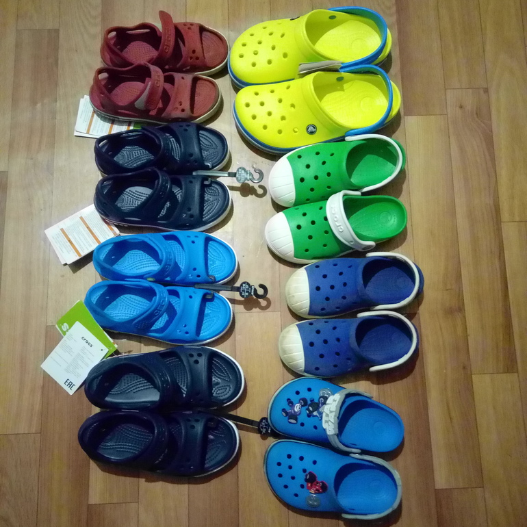 У крокс есть одна хитрость. Материал становится пластичным под воздействием температуры. Нагрейте в горячей воде и оденьте на носок на сына, кроксы сядут как говорится "по ноге". Проблему с натираниями это обычно решает. А потеют при какой температуре?) просто кроксы это не панацея от непотения. В 35 градусов нога будет потеть во всем. Просто сам материал гигроскопичен, не дает расти бактериям, обувь не пахнет) (муж тоже в кроксах). Ну и сохнут быстро xD