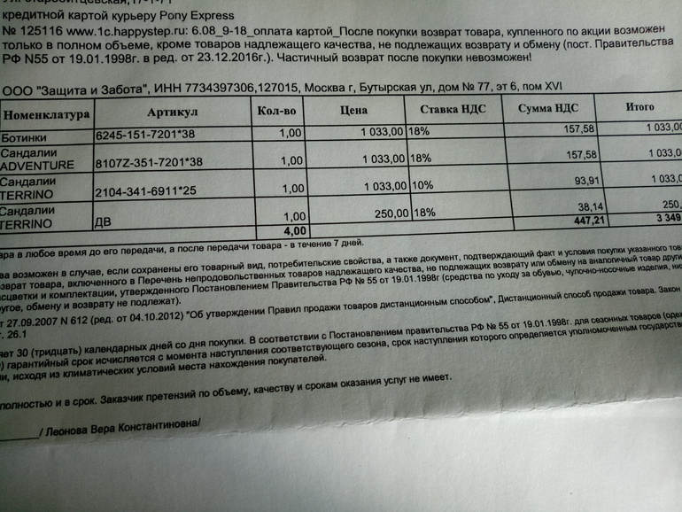 На товарной накладной написано, что частичный возврат после покупки невозможен.