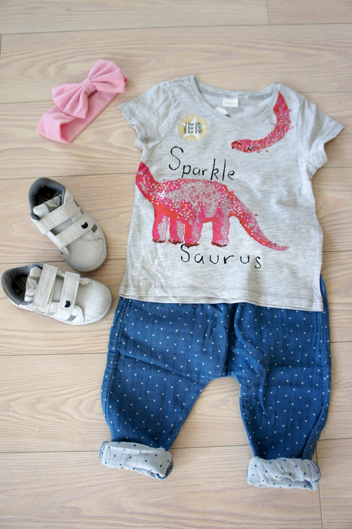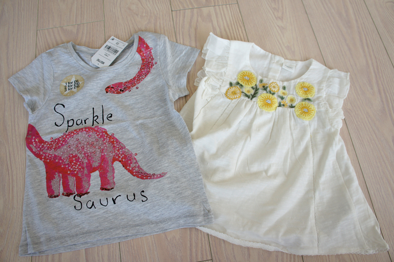 Футболки и брючки в горошек. Футболочки некст на 2-3 года. Брючки зара 18 мес. Качество супер. К белой футболочке надо было купить леггинсы...в следующий раз.