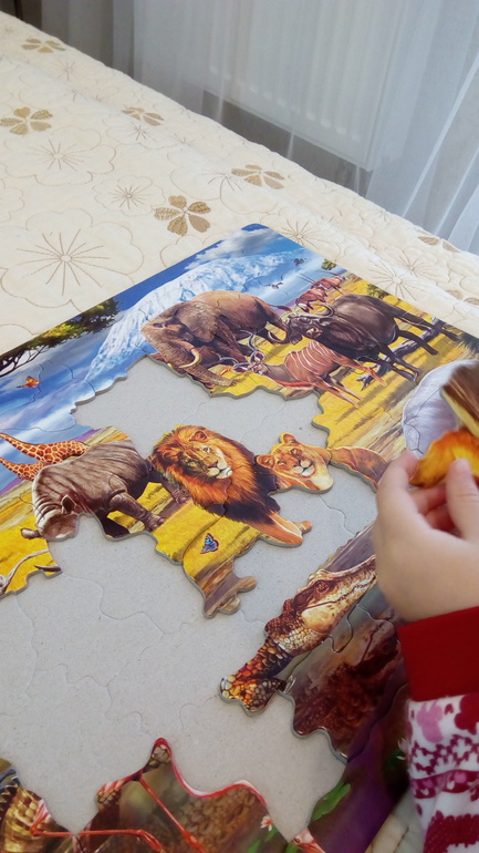Мне и дочке очень нравятся пазлы Ларсен, только вот цена мне не очень нравится. В два годика собирала из 25 деталей.