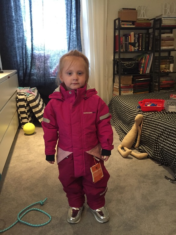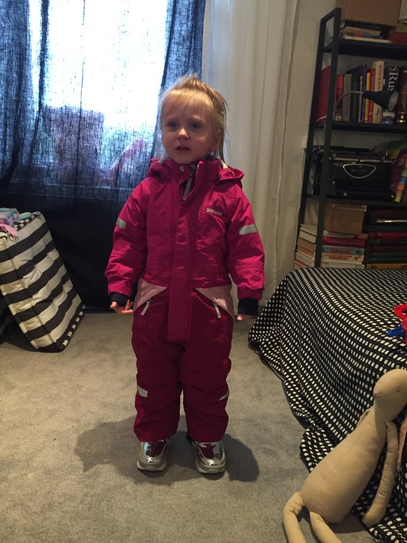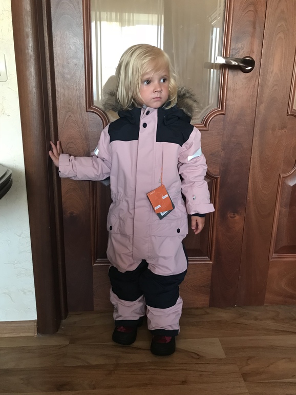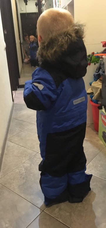вот это размер 80(!) с нераспоротой системой роста+ на толстые спортштаны, которые не стала заправлять в сапоги и они задрались под комбинезоном (а поправить женя не дала). Фактически, штанины длиннее.