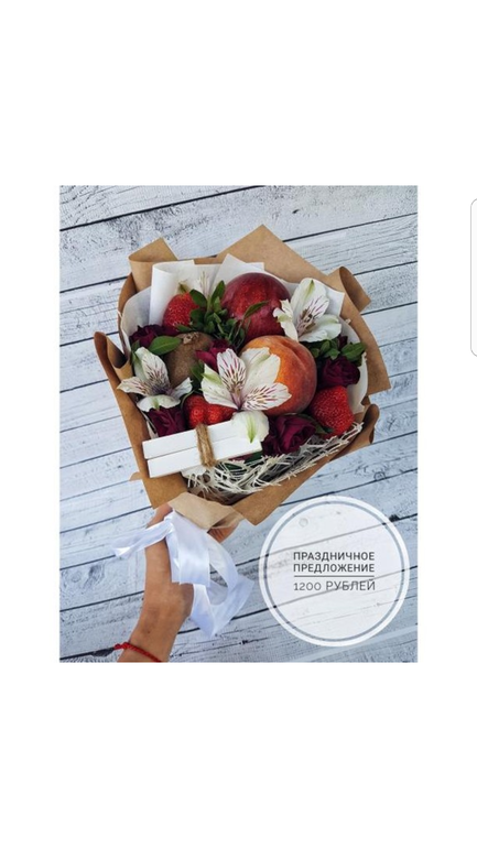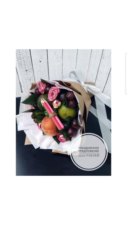 С фруктами букеты тяжелые, держать надо ровно- у первоклашки должны быть приличные бицепсы)))