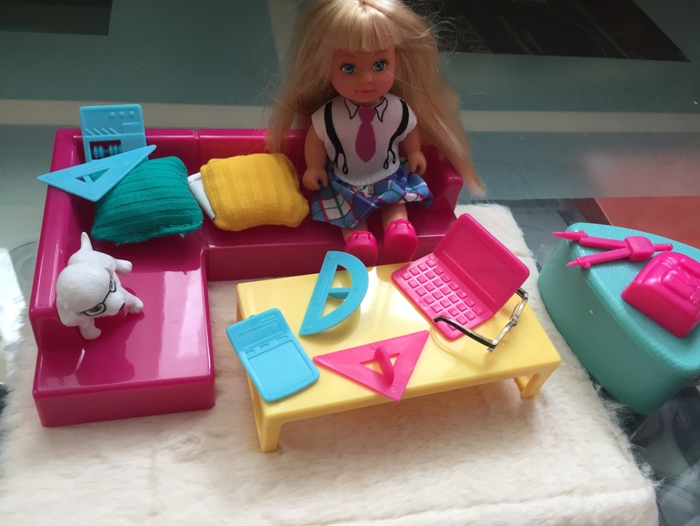 Набор мебели для маленьких кукол Lori by Battat 700 p в Детском мире, качели из фикс прайс 100 р и кукла Stefi с аксессуарами для школы из Дикси.