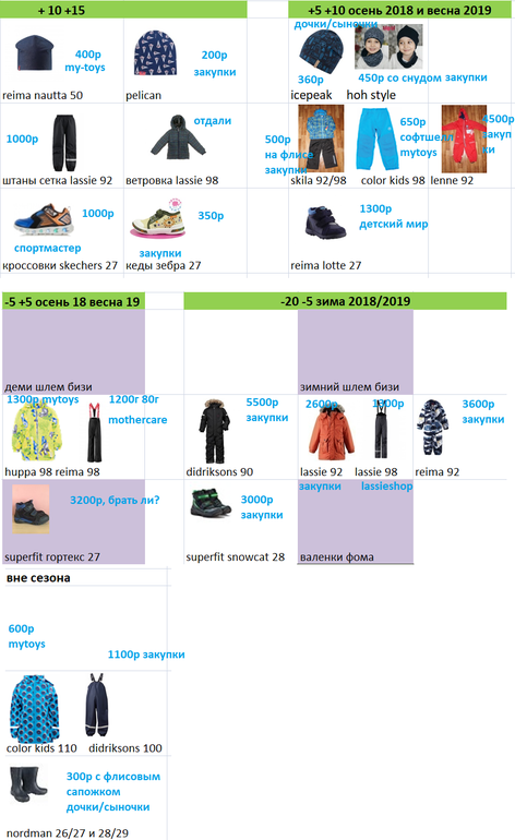 Только хвасты! (одежда и обувь)Определилась наконец! Вот фото гардероба с ценами. Вроде хорошо получилось. Фиолетовым докупки для себя выделила. Все еще сомневаюсь нужны ли между reima lotte и superfit snowcat мембранные кроссовки.