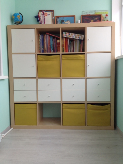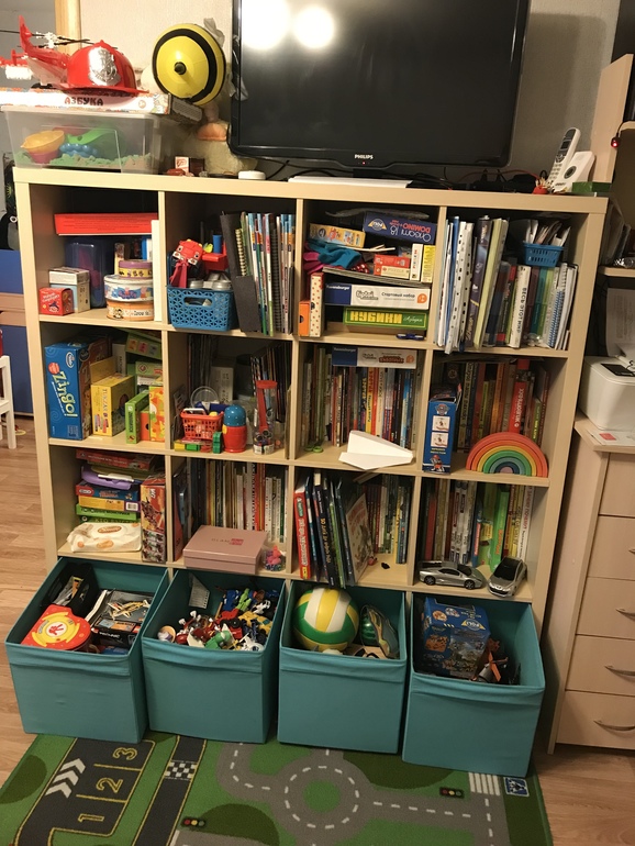 У нас тоже икеевский Каллакс с разными вставками (2 ящика, открытые полки и короба). Небольшой стеллаж билли для всевозможных товаров для творчества. И система из стеллажей и полок под книги и настольные игры. В отдельных контейнерах дупло, железная дорога и игрушки младшей.