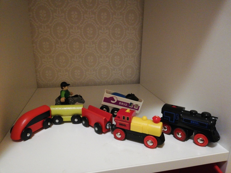 Вот два бриовских паровоза, а вагоны из Икеи, они сверху закрыты. Может, у Брио есть вагоны, чтобы катать. Но это дорогая фирма, я её даже не смотрю, купила только паровоз, чтобы сами ехали и все))