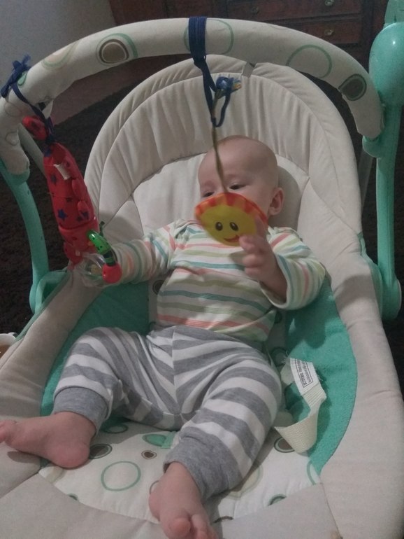 Может быть стульчик для кормления (если есть от 0), чтобы он там лежал высоко (не на уровне кроватки, а повыше) и ему было всех видно.