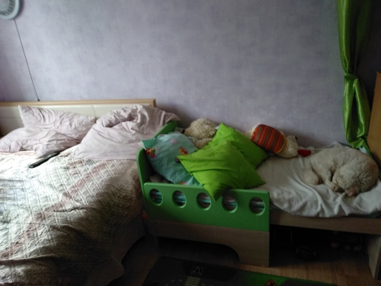 У нас сейчас вот так. Раньше кровать вдоль стенки стояла за шторкой. Штору не закрывали, но сын там не спал. Вернее как. Он засыпал с нами, мы перекладывали и он спал до середины ночи и потом опять к нам бежал. Сейчас я решила постепенно приучать его засыпать и спать в своей кровати. Придвинула кровать его к своей кровати. Первую ночь держала за руку пока он засыпал и ночью просыпался руку просил. Вот прошло недели 2 наверное. Он и в дневной сон (в выходные) и на ночь спит в своей кровати и за руку уже не просит держать.
