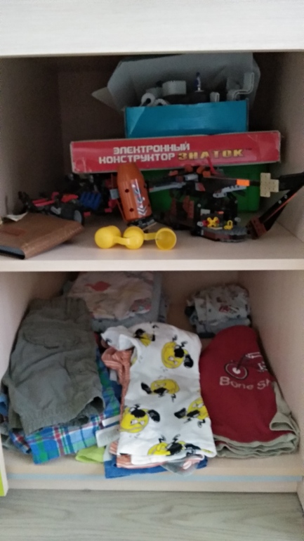 Внутри полки. С одной стороны игрушки, постельное и домашняя одежда.
