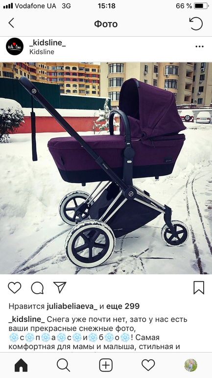 Пока она - мой фаворит) Легкая, маневренная, я ее несколько раз в неделю вожу в багажнике. Очень удобно, что она на 2 части легко раскладывается: нетяжело закидывать в машину. Ребёнок сидит удобно, она высокая достаточно, можно его к столу в кафехе придвинуть и кормить в коляске. Катаю ее почти год, мне в ней все нравится. По снегу нормально едет, амортизация отличная.