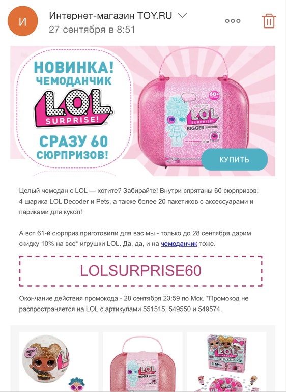 Распродажи. Скидки. Акции.может кому пригодится, пришло письмо от той.ру со скидкой 10% на все лол кроме трех артикулов указанных по сноске, заказывала у них пару раз приходил точно оригинал