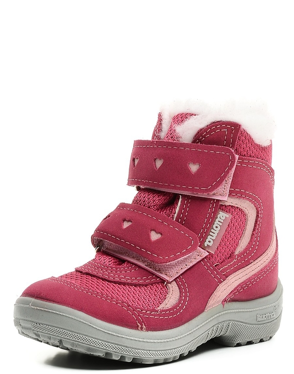 Зимние ботинки для девочек. Подошва полиуретан, верх полиамид с водоотталкивающей пропиткой, армированный кожей, пропитанной полиуретаном, внутри мех, войлочная стелька Колодка специально разработана для детской ноги. Концепция модели позволяет легко одевать и снимать сапог. Подходит на любой подъем ноги.