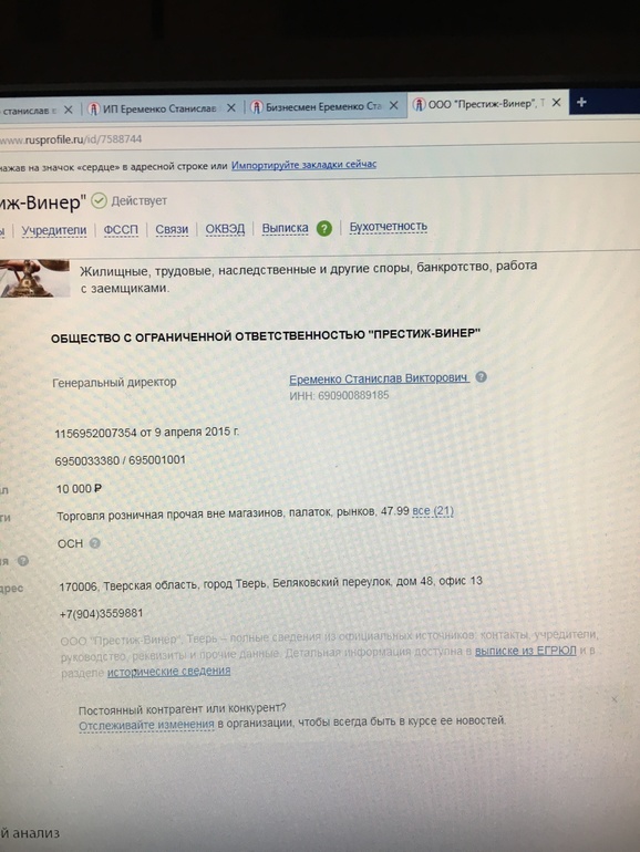 Индивидуальный Предприниматель Еременко Станислав Викторович действует с 13.12.2017. Основной вид экономической деятельности Торговля розничная телекоммуникационным оборудованием, включая розничную торговлю мобильными телефонами, в специализированных магазинах. Присвоен ИНН 690900889185, ОГРНИП 317695200058830.