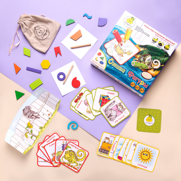 Есть отечественная игра "Оживи фигуры" от компании ЯиГрушка, в которой надо рисовать предметы, животных и любые другие рисунки на основе деревянных фигур (трафаретов). В комплекте 24 деревянных фигурки, которые хранятся в мешочке, 72 карточек с примерами рисунков для начинающих игроков, 120 листов бумаги, 4 карандаша, 4 ширмы (для соревнования), правила с тремя вариантами игры и бесконечный увлекательный игровой процесс!!!