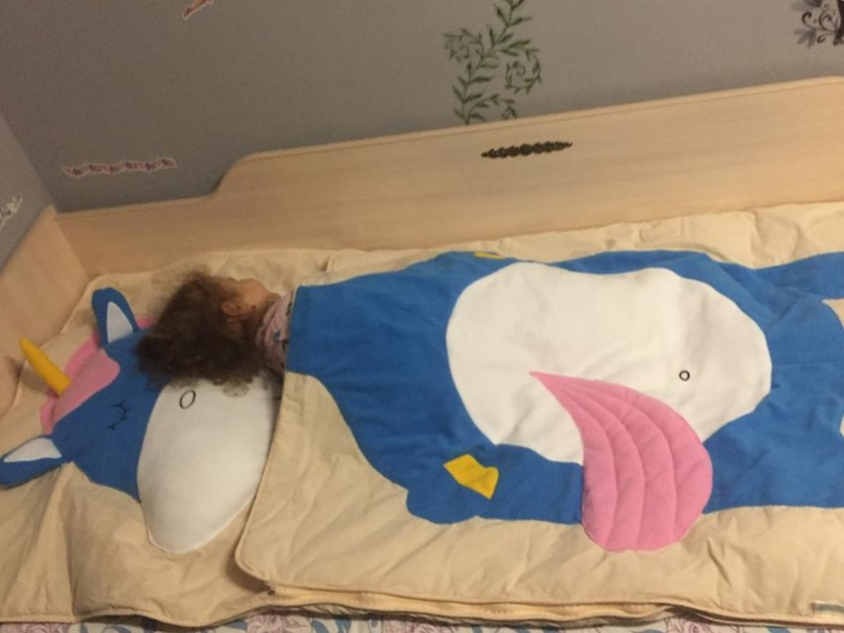 У нас всегда были проблемы с укрыванием и одиноко ей в кровати ))) Каждый вечер приходилось уговаривать идти к себе в кроватку.