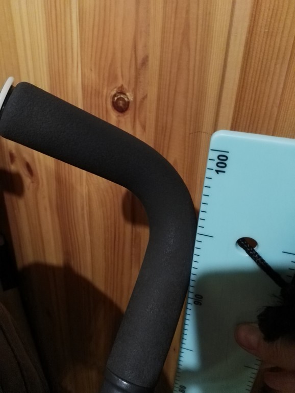 Измерить не могу, мы на даче, а она в городе, но я при росте 175 сначала постоянно наступала ей на колеса, потом приспособилась и катаю нормально, но руки получаются ощутимо вытянуты и напряжены, а не расслабленно лежат на ручке.