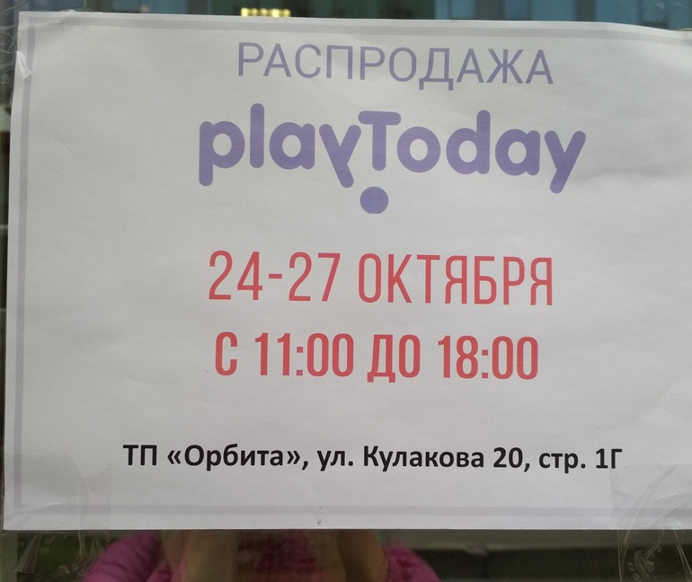 Распродажи. Скидки. Акции.Девочки из Строгино и близлежащих районов, в бизнес-центре Орбита завтра -последний день распродажи складских остатков Play today. Майки -100, футболки - 150, трикотажные комплекты -250-300. Зимние костюмы/комбезы "прошлых" коллекций -500-700 руб, "новых" - 1000-1500. Туфли, ботинки малышковые - 400-450 руб.
