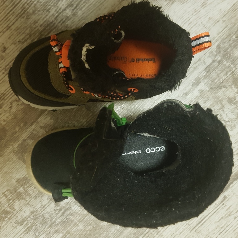 Наши носки из шерсти мериноса еще в пути, поэтому я переобула ребенка из экко, которые типа до минус 5 в зимний вариант гортекс - тимберленд. У них начес сильнее и подошва толще. Мы малоактивные вдруг стали, а ноги в них теплые. А обычно холодные всегда были в экко, что в плюс 8, что в плюс два, но никогда не жаловался.