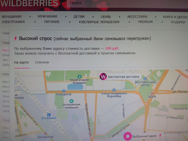 я положила товар выбрала пункт самовывоза, написано на пунтке высокий спрос значок тока, доставка 100 руб, а заказала трусы за 500