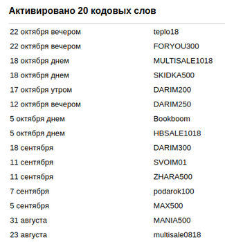Здесь девочки выкладывают кодовые слова, я ещё у девочки в Инстаграмме подсматриваю. Ими 25% покупки можно оплатить