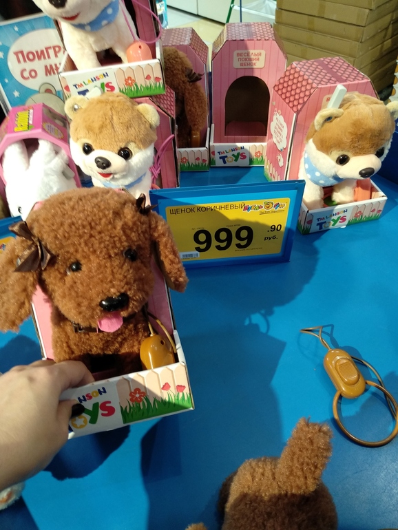 ИгрушкиСегодня были в магазине Бубль-гум, очень понравились собачки, они поют, вертят хвостиком, немного ходят. Вокруг стояла куча мамочек, все восхищались как дёшево и надо брать всем на новый год))) Я поддалась и ребенок весь день играет (нам год и 5). У собаки провод-поводок, на конце кнопка включать. В общем милая игруха, вдруг кому надо 😉