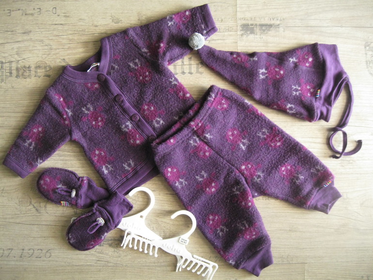 Вспомнила, в прошлом году было шерстяное термо от Joha, шерстяной флис называется. Вот оно очень тёплое, можно и в морозы только им одним обойтись, но на голое тело всё-таки немного колется. И в плане практичности, грудничку то ещё нормально, он лежит и не пачкается, стирать не приходилось. А от частых стирок этот шерстяной флис как бы протирается.