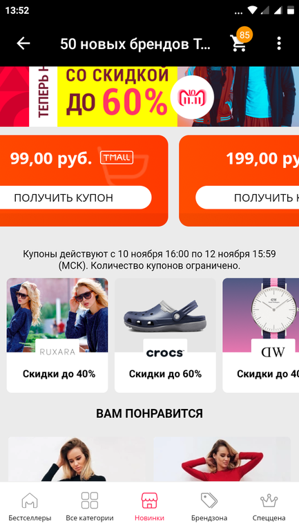 Также появился раздел с новыми брендами Крокс ,Лесси,рейма, и т.д. там есть купоны 99 от 1000, 199 от 2 т.р и 399 от 4 т.р., действует только на спец раздел. Цены так себе.