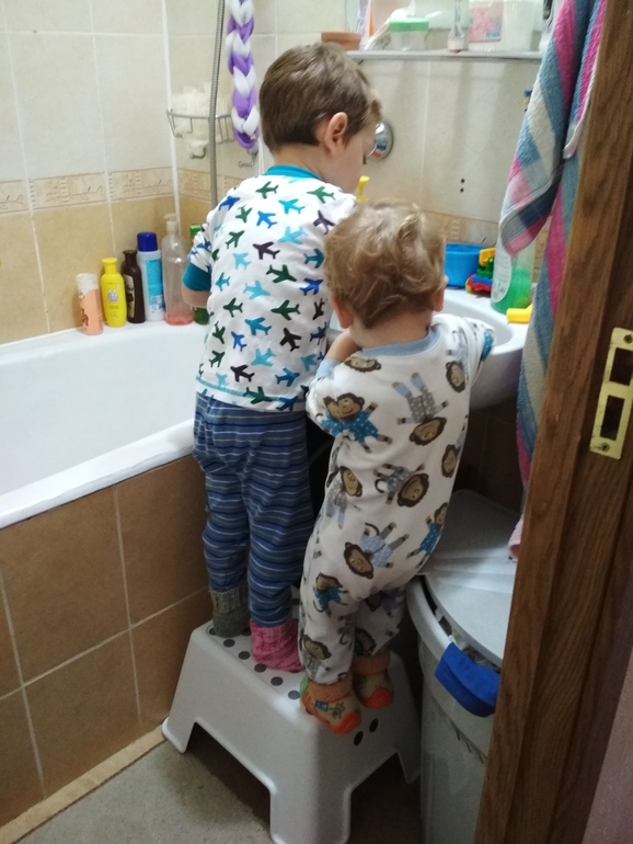 Ничего не подставляю. Тоже пока не достаёт-безопаснее будет. Слазит сам. Но уже может из ванны притащить скамейку-ступеньку. Плитку в квартире закрыли мягкой плиткой