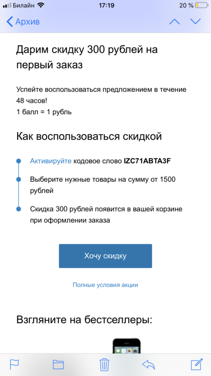 Катюня в Выбор товаров 7 лет Страна Оз скидка 300 рублей на первый заказ Распродажи. Скидки. Акции. Посмотрите еще 20 записей на эту тему Отменить Ответить Natasha публикация реферальных кодов запрещена вроде тут 04.12.2018 Ответить лар--чик Такое присылают на новый аккаунт, где нет ещё ни одного заказа. У вас новый? 03.12.2018 Ответить ФотографКарасеваМарина личная, на новый ак присылают 03.12.2018 Ответить МаХаКа Не являетесь участником акции 03.12.2018 Ответить Века Это наверное Ваша личная скидка,у других не пройдет 03.12.2018 Ответить На Оз подешевело Лего серии Гарри Поттер W*b скидка на все Чаты Беременных Выберите чат: Январята-2026 Февралята-2026 Мартята-2026 Апрелята-2026 Майчата-2026 Июнята-2026 Июлята-2026 Августята-2026