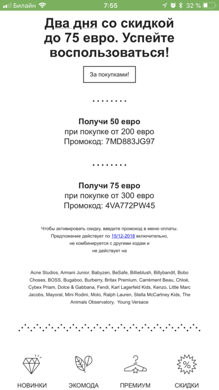 Код проходит но немного криво, на акцию скидывает в районе 35 евро. Спасибо! Затарилась моло)