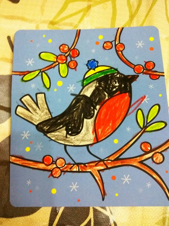 Открыли посылку, а оттуда посыпались подарки от нашей ярославкой снегурки и ее верного помощника Гриши, который раскрасил сам открытку. Вот такую: