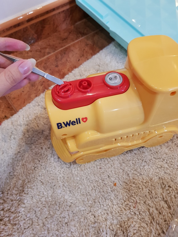 У меня не паровозик,но тоже B.Well. Открывается эта штука вообще без усилий - поворачиваешь против часовой и вытаскиваешь, там примитивные пазики в лобинку заходят и поворачиваются, чтобы потянув не открывалось. Чё-то не так с вашей этой штукой.