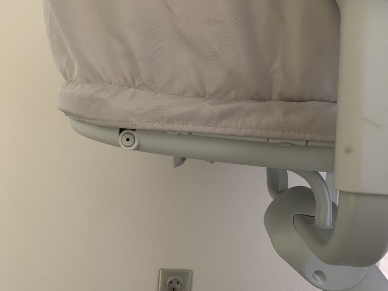 Ко всему прочему можно регулировать высоту. Легко поставить на уровень со взрослой кроватью ночью, чтобы в случае чего подглядеть за малышом или соску впихнуть не вставая, или взять к груди приложить. Достаточно лишь нажать ногой на большую серую кнопку и бесшумно опустить люльку на нужную высоту.