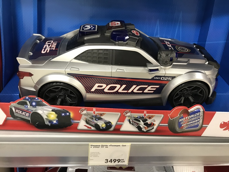 И большая машина - это просьба 3-х летки. В Кораблике он увидел полицейскую машину, дикки тойс. Но мне хотелось бы более функциональную (а может и взять эту машину ему? На одну кнопку нажимаешь-она едет, на другую нажимаешь - багажник открывается)