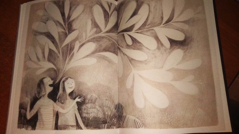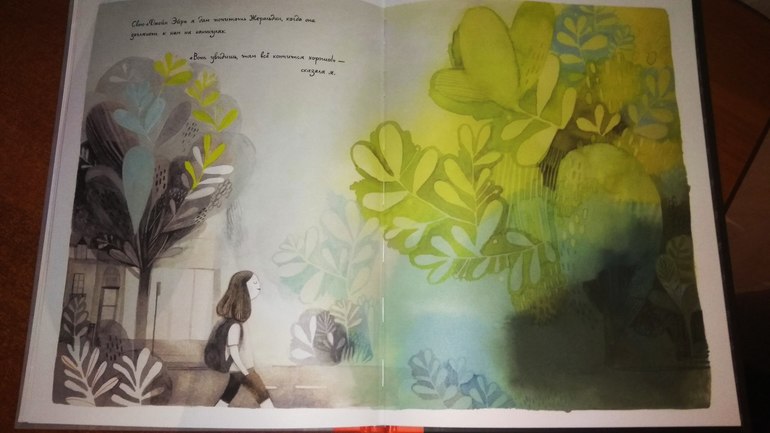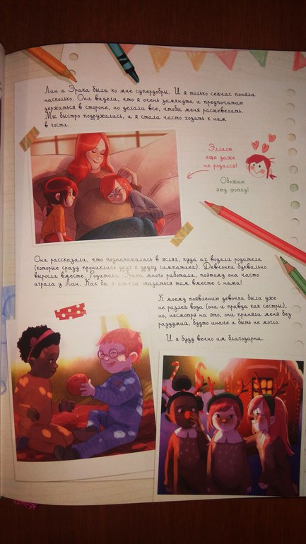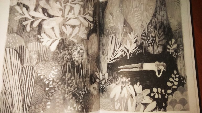 На страницах изображены темно-серые иллюстрации-это темно серая жизнь девочки и яркие страницы-с приятными эмоциями
