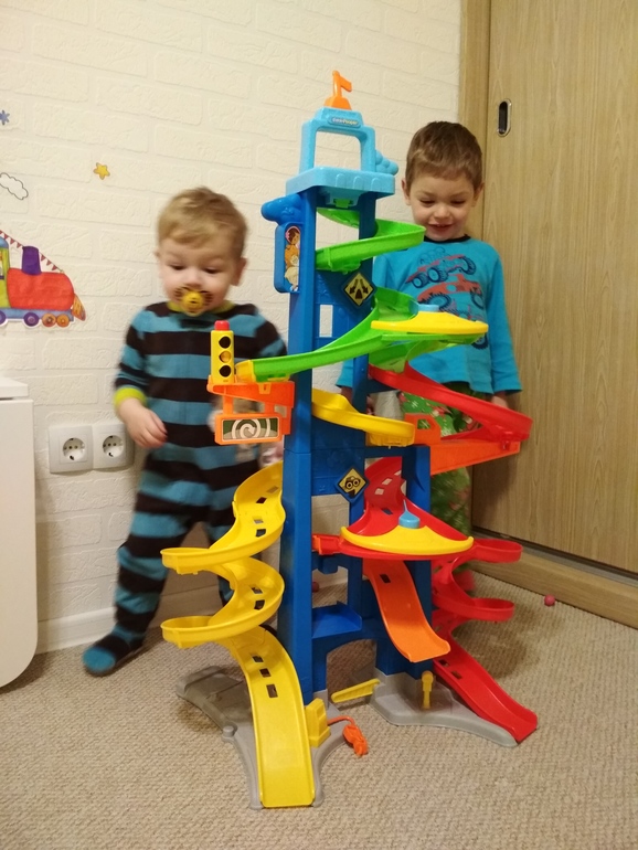 Мальчикам моим 1.5 года и 3.5 лет. Дед Мороз подарил трек младшему, но дикий интерес даже у старшего есть, точнее, именно он сейчас им больше и пользуется в силу роста, младший до верхушки еще не дотягивается.