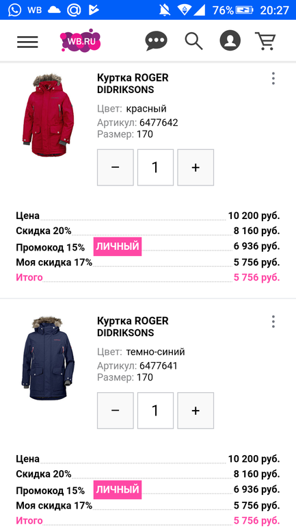 Вера в Выбор товаров 7 лет На в,,б Распродажи. Скидки. Акции. Хорошая цена куртки дидриксонс Роджер 5756 https://www.wildberries.ru/catalog/6477641/detail.aspx?targetUrl=LC&_ga=2.119674637.487159514.1546790654-1392886767.1540155719&_gac=1.52999642.1543734113.Cj0KCQiA_4jgBRDhARIsADezXcjI_VMSoYF5EEWFIgGJIttZGGEImPAjSlrtJ487ODDyDTyIJzqU-LcaAi5aEALw_wcB Посмотрите еще 20 записей на эту тему Отменить Ответить Наталья Сегодня еще дешевле -5621руб 07.01.2019 Ответить Вера Да, но размер мой уже закончился((( А на озоне его давно разобрали. 07.01.2019 Ответить tatiana Должна дешевле быть, я её сыну перед сезоном на озоне брала за 5400 в начале ноября. А сейчас вроде как распродажи. 06.01.2019 Ответить Татьяна А я там же за 4700 06.01.2019 Ответить В ж и к Как это у вас так? У меня 06.01.2019 Ответить Вера Ещё личная скидка 17%. 06.01.2019 Ответить В ж и к Другим не заказываете? 06.01.2019 Ответить Анастасия Сегодня 5621, могу заказать, если точно выкупите, а то у меня там скидка на грани) А вы брали уже такую? А то все думаю, брать ли своим... Или ещё пока комплекты по ярче взять. 07.01.2019 Ответить Вера Я уже заказала Ольге. 07.01.2019 Ответить В ж и к Хаки заказала 07.01.2019 Ответить tatiana Это со спасибо, наверно) без них дешевле не получалось)) 06.01.2019 Ответить Татьяна Не помню уже честно говоря. Помню, что была акция 2+1 и я клала куртку и две пары гольфов и минус 500 за онлайн оплату и минус баллы 07.01.2019 Ответить Lu Lu в Фамилии Фамилия в ТЦ Рубин в Твери. Чаты Беременных Выберите чат: Январята-2026 Февралята-2026 Мартята-2026 Апрелята-2026 Майчата-2026 Июнята-2026 Июлята-2026 Августята-2026