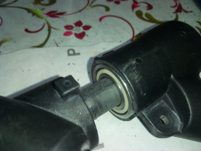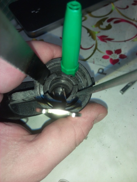 .Далее начинаем работать с вилкой. Внутренний диаметр подшипника 17,7, диаметр пластиковой втулки пальца примерно 18. Шкуркой утоньшаем палец до того, чтобы на него плотно насаживался подшипник. Упор в нижней части пальца тоже надо убирать, я его срезал ножовкой и потом доводил надфилем и шкуркой до круглой формы.