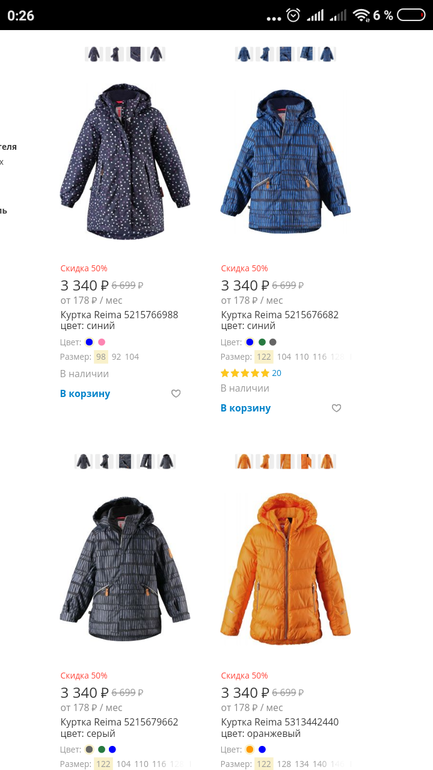 я на reimashop заказала, там тоже -50% и еще 500р за первичную регистрацию. написано от 5000, но у меня прошел на комбинезон за 3000 пухури, получился 2750р.