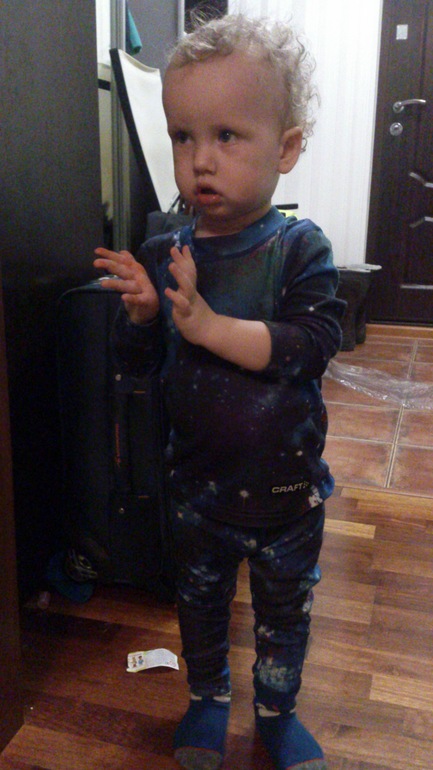 У нас в группе 26 градусов, поэтому без вариантов футболка и шорты. Соответственно, сверху на то в чем в группе одеть комбез и пойти - никак. Да, переодевается полностью, но для него это не проблема. И вещи свои знает, и что одеть знает.
