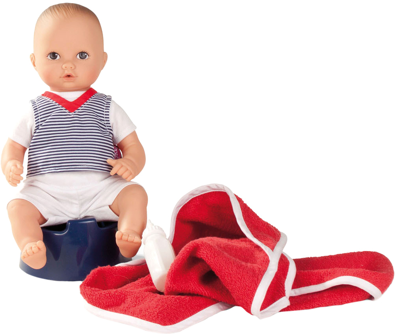 Первую маленькой дали Готц пупса небольшого, весь плотный, но округлый и приятный, и не тяжёлый - легко за руку таскать с собой, легко мыть после прогулки, он ещё и с ней в ванной купается. И к нему горшок есть, по идее потом можно поить из бутылки (у нас потеряна) и писать. Мы пока за компанию на горшок пупса тоже сажаем)
