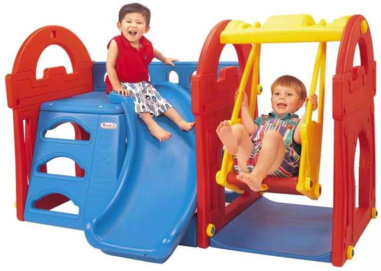 Может быть сдать его, если совсем не понравился? Обидно, когда за немалые деньги покупаешь вещь сомнительного качества. Могу теперь поделиться своими впечатлениями. Купили корейский игровой комплекс HAENIM TOY. Достоинства: легкая сборка (муж собрал минут за 15), хорошее качество пластика, ребёнок был в восторге (надолго ли?). Недостатки: совершенно бесполезные качели (мелкое скользкое сидение) - качаться на них ребёнок не может. Учитывая, что качели - это половина всего комплекса, покупка неоднозначная. Короче, надо было купить горку и радоваться жизни (но кто же знал!):) Вот так это выглядит: