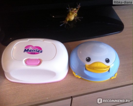 У нас были такие контейнеры Меррис розовый и зеленый. Туда можно докладывать салфетки, дно открывается. Но со временем нажималка эта для открытия крышечки убивается в хлам. Про утенка не знаю