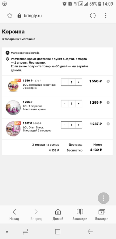 Я зарегестрировалась со своего телефона и сделала заказ, получилась куколка 798 руб. 👍👍👍