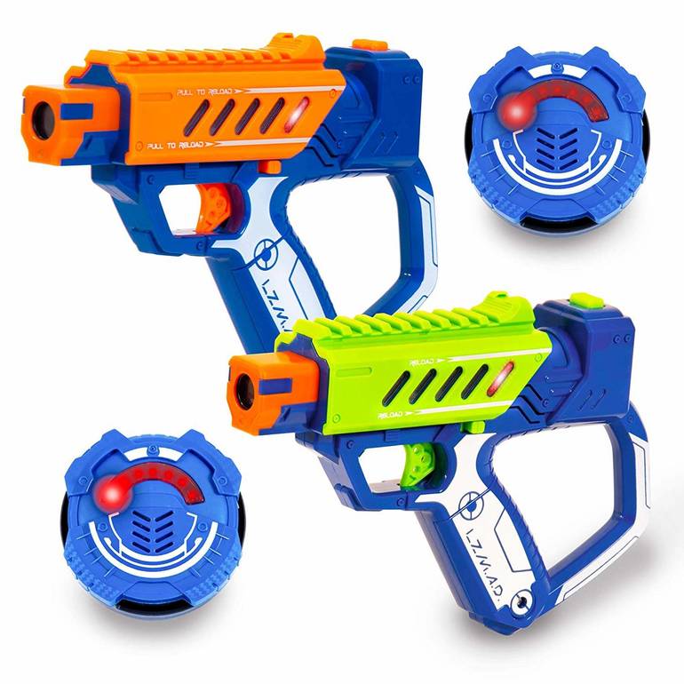 Они есть в нескольких вариантов. У одних нужно попасть В пистолет, чтобы за считалось попадание, у других в маленькую мишень, которую на видео одевали на себя.