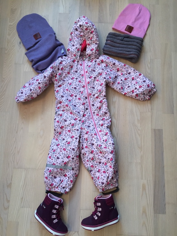 Сегодня потеплело и планирую переодеть в Лесси 80гр, комбинезон остался с прошлого года, март думаю относим и всё. Шапки bodo, вязаный снуд "ЕМАЕ", на ноги рейма паттер.