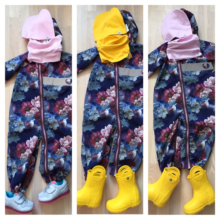 При +15 или раньше (буду смотреть по ребёнку), будет носить софтшелл Racoon. Раньше софтшелла у нас не было, пока не понимаю когда в нём будет не холодно и не жарко. К нему планирую кроссовки Demix (подошва мигающая) и возможно сапоги crocs. Накидала варинтов с шапками - не слишком пестро будет с желтыми сапогами? Расцветка у комбинезона сама по себе достаточно яркая, боюсь переборщить.